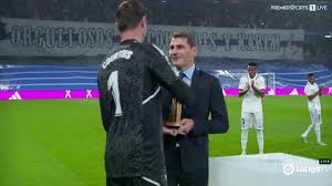 سلم الدولي الاسباني ايكر كاسياس اسطورة نادي ريال مدريد جائزة أفضل حارس في العالم لتيبو كورتوا قبل انطلاقة المباراة التي تجمع النادي الملكي ضد نادي اشبيلية.