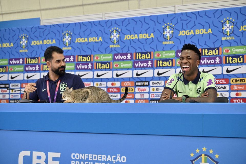 وأظهرت الصور تواجد فينيسيوس جونيور لاعب منتخب البرازيل في المؤتمر الصحفي، وأثناء حديثه قاطعت تصريحاته قطة، وجلست أمامه على منصة المؤتمر الصحفي وكأنها تعمدت خطف الأضواء منه، لينفجر بعدها اللاعب البرازيلي ضحكاً، وكذلك الصحفيين الموجودين بقاعة المؤتمر.