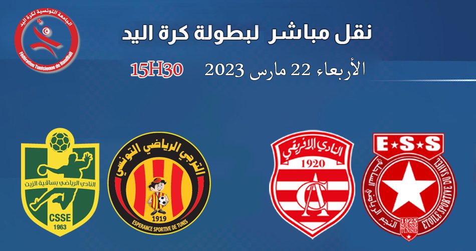 تُقام اليوم الإربعاء 22 مارس 2023 مواجهات الجولة الأخيرة من المرحلة الأولى للبطولة الوطنيّة لكرة اليد ، و سيُنقل كل من كلاسيكو النّجم السّاحلي و النادي الإفريقي و مواجهة الترجي الرياضي التونسي و نادي ساقية الزيت على قناة جوهرة تي في (تردّد القناة NILESAT 11657 V SR 27500 FEC 2/3).