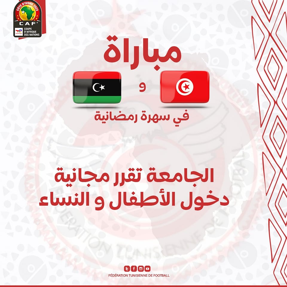 بمناسبة مباراة الجولة الثالثة من تصفيات كأس إفريقيا للأمم الكوت ديفوار 2023 بين المنتخبين التونسي والليبي المبرمجة ليلة الجمعة 24 مارس 2024 في سهرة ثاني أيام شهر رمضان المبارك بالملعب الأولمبي حمادي العقربي برادس ولتمتيع أكبر عدد ممكن من الجماهير الرياضية من حضور اللقاء قررت الجامعة التونسية لكرة القدم مجانية دخول الأطفال والنساء وسيكون الدخول بالنسبة للذكور الذين تتجاوز أعمارهم 18 سنة بالتذاكر وفق الأسعار التالية: