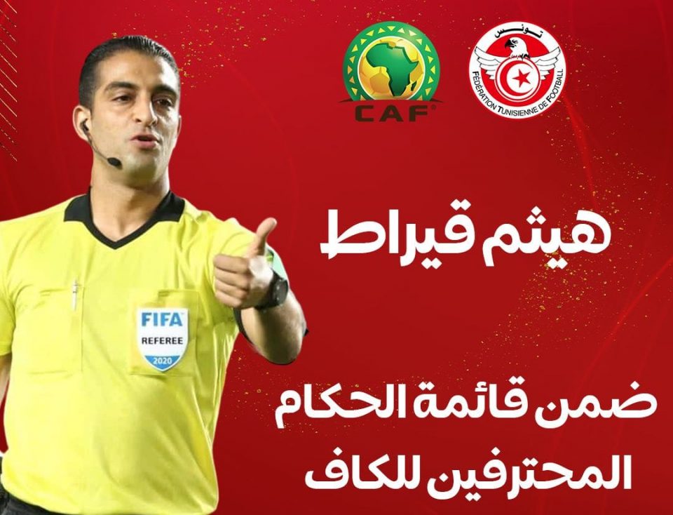 أعلنت الجامعة التونسية لكرة القدم اختيار الحكم الدّولي التّونسي هيثم قيراط ضمن قائمة الحكّام الأفارقة المحترفين من قبل الاتحاد الإفريقي لكرة القدم، الكاف.