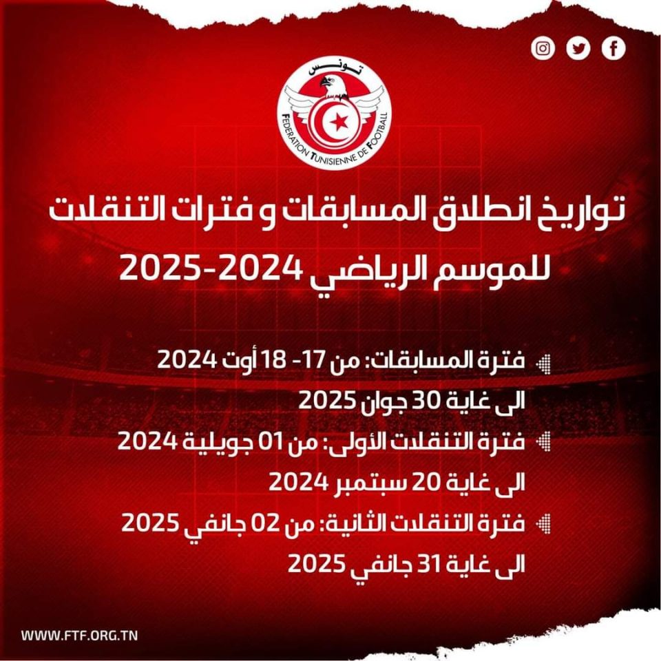 أكدت الجامعة التونسية لكرة القدم في البلاغ صادر عنها أن الموسم الرياضي الجديد 2024 ـ 2025 سينطلق يوم 17 أوت إلى غاية يوم 30 جوان 2025