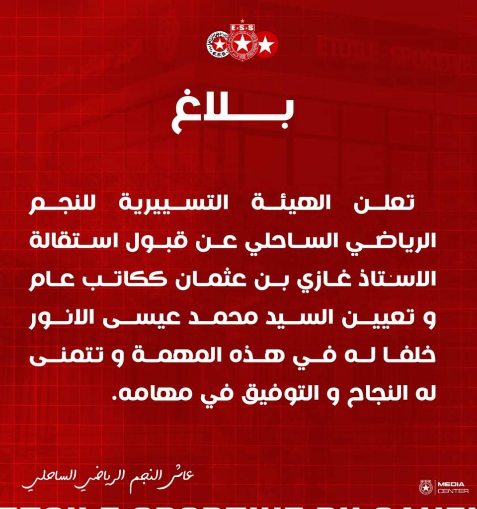 كرة قدم وطنيةاستقالة وتغيير على مستوى الكتابة العامة النجم الساحلي by M H4 أغسطس، 20240617 Share0 أعلنت الهيئة التسييرية للنجم الرياضي الساحلي عن قبول استقالة الاستاذ غازي بن عثمان ككاتب عام وقد تم تعيين محمد عيسى الانور خلفا له .