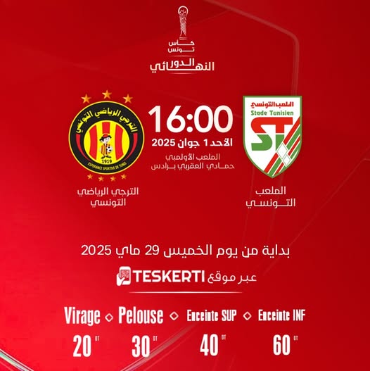 تنطلق اليوم الخميس 29 ماي 2025 عملية بيع تذاكر مباراة نهائي كأس تونس بداية من الساعة 12:00 عبر موقع teskerti.tn بين الملعب التونسي والترجي الرياضي والتي ستقام مساء يوم الأحد 1 جوان 2026 ، وستكون أسعارها 20، 30، 40 و 60 دينارًا.
